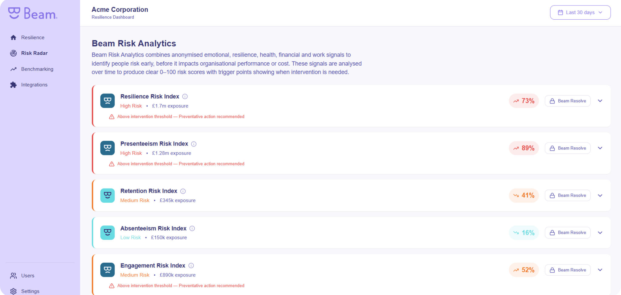 Teams using Beam identify risk signals weeks earlier, contributing to up to a 22% reduction in presenteeism.